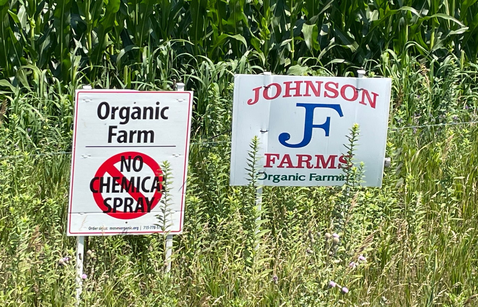 Instead of herbicides, he must drive a cultivator over his crops to remove as many weeds as possible from the land between crop rows. About 5% of his land is preserved as buffer strips and shelter belts that form a natural barrier between croplands and between his organic crops and those of neighboring conventional farms to block chemical drift. Signs are placed in ditches along his crops so pesticide contractors hired by conventional farmers do not apply chemicals to Johnson’s crops by mistake.