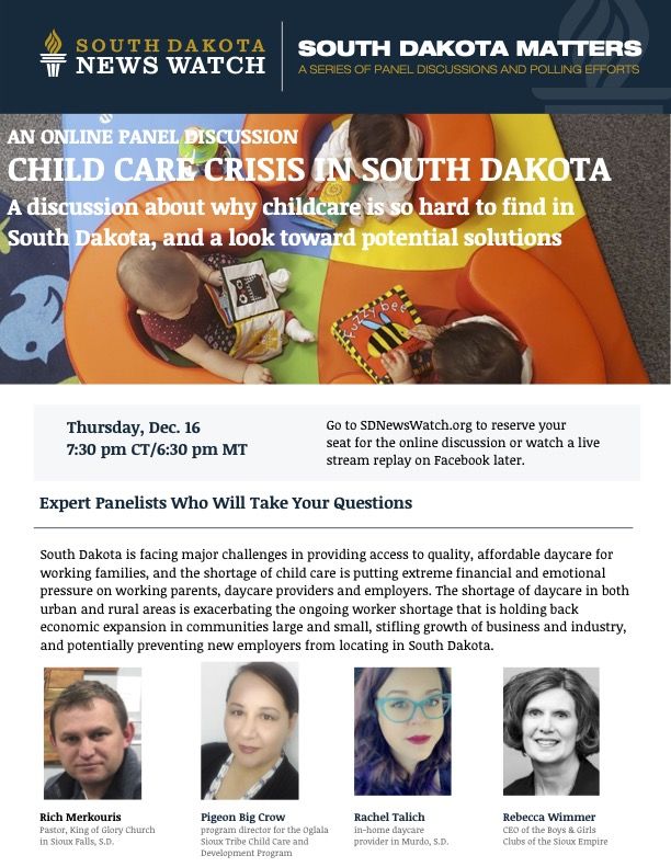 On Wednesday, Dec. 15, South Dakota News Watch will publish a special report on the crisis, and on Thursday, Dec. 16 at 7:30 p.m. Central/6:30 p.m. Mountain, News Watch will host a one-hour online panel discussion with experts who will explain the daycare crisis and discuss potential solutions to the problem.